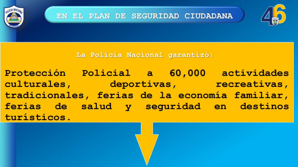 “Se garantizó protección policial a 60 mil actividades culturales, deportivas, recreativas, tradicionales, ferias de la economía familiar, ferias de salud y seguridad en destinos turísticos. También se realizaron un total de 28 mil 223 acciones preventivas. Visita a líderes comunitarios, encuentro con la comunidad, visitas casa a casa, atención a jóvenes en situación de riesgo”, indicó la comunicación de la institución del orden público.