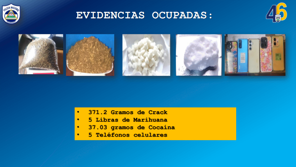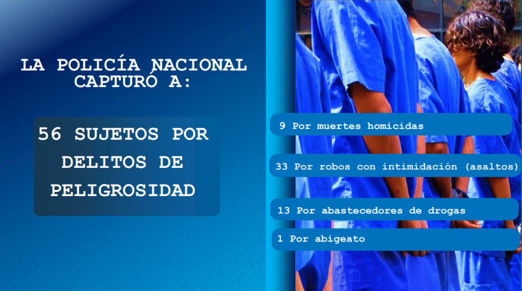 “Como parte de este plan, la Policía Nacional logró la captura de 56 sujetos por delitos de peligrosidad, nueve por muertes homicida, 33 por robos con intimidación, asaltos, 13 por abastecedores de drogas y uno por abigeato. Evidencias ocupadas, 371.2 gramos de crack, 5 libras de marihuana, 37.3 gramos de cocaína y cinco teléfonos celulares”, detalló el informe oficial.