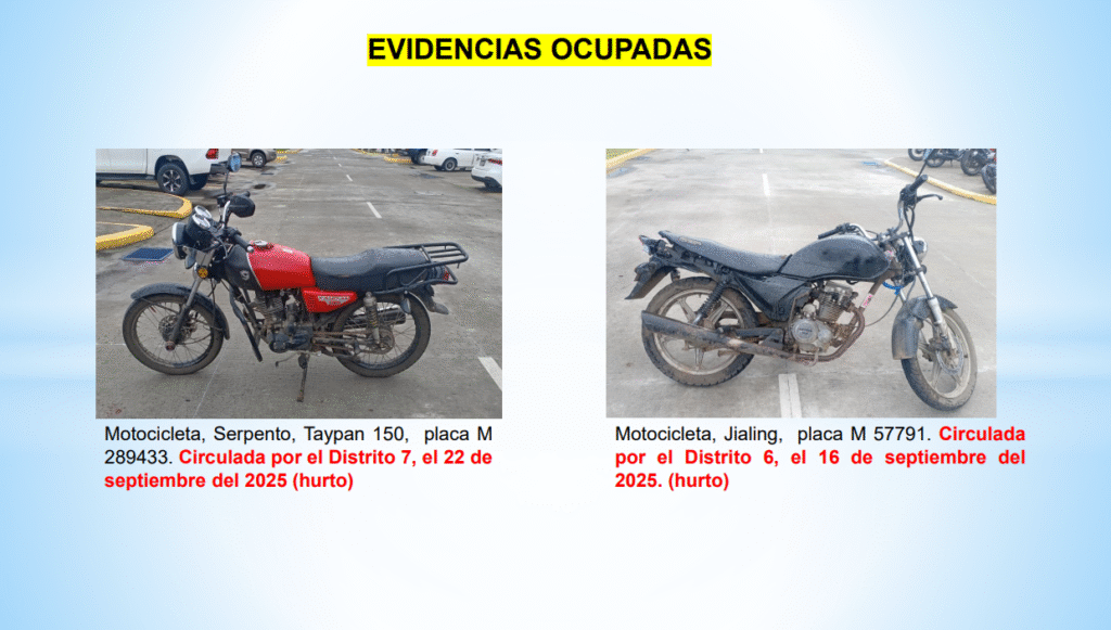 Como evidencias, la policía les ocupó dos motos que eran ocupadas para cometer sus fechorías, las cuales, también estaban circuladas porque con ellas se cometieron hurtos en los Distritos VI y VII de Managua.