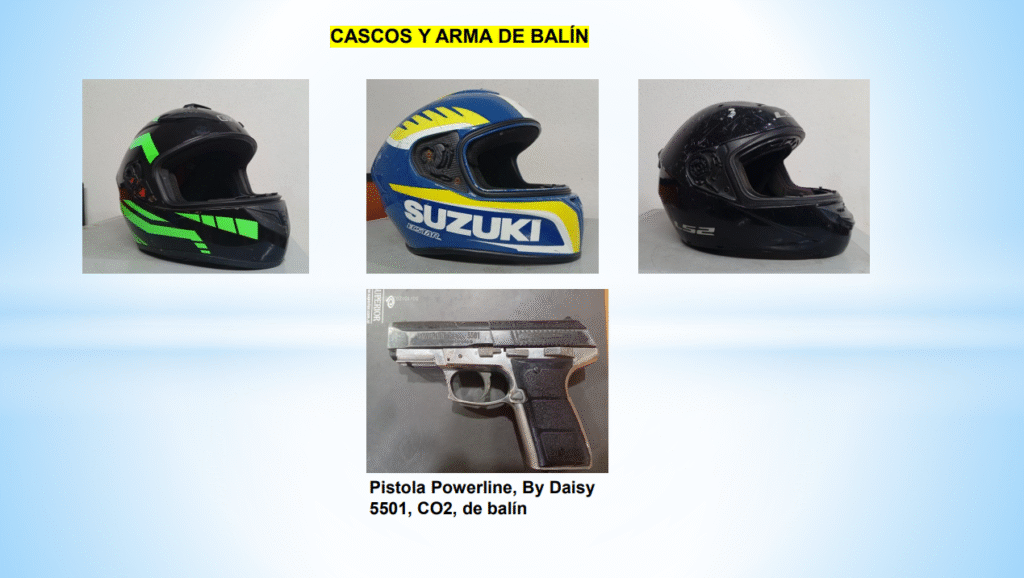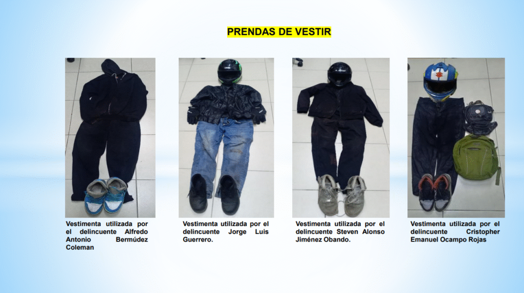 Los detenidos son: Cristofer Emanuel Ocampos Rojas de 33 años, Alfredo Antonio Bermúdez Coleman de 23 años, Jorge Luis Guerrero de 32 años y Steven Alonso Jiménez Obando de 24 años, quienes a bordo de motocicletas e intimidando con armas de fuego, sustrajeron dinero y teléfonos celulares a guardas de seguridad, clientes y trabajadores.
