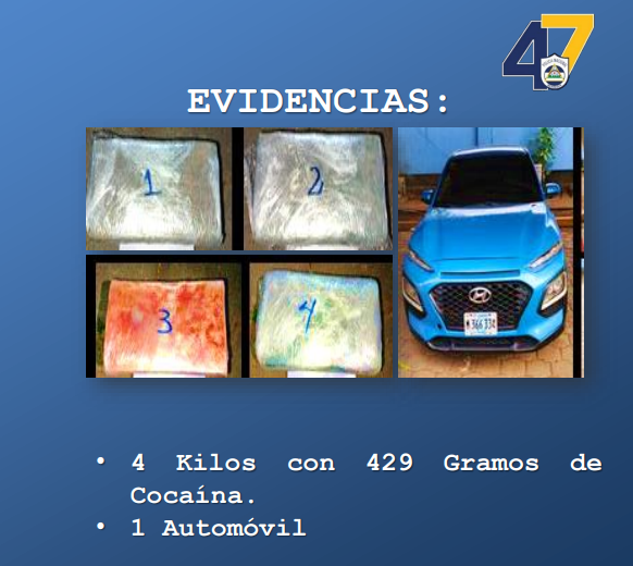 Al realizar la inspección del vehículo, los agentes encontraron un bolso que contenía cuatro paquetes rectangulares con sustancia blanca. Las pruebas de campo confirmaron que se trataba de cocaína, con un peso total de cuatro kilos con 429 gramos.