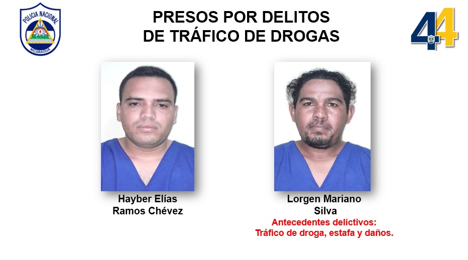 Lorgen Mariano Silva, de 41 años de edad, y Hayber Elías Ramos Chévez, de 28 años de edad, fueron capturados en Rivas al momento que trasladaban más de 3 kilos de cocaína, valorados en 83 mil 575 dólares en el mercado estadounidense de las drogas, informó el comisionado general Félix Villareal, jefe policial en este departamento.