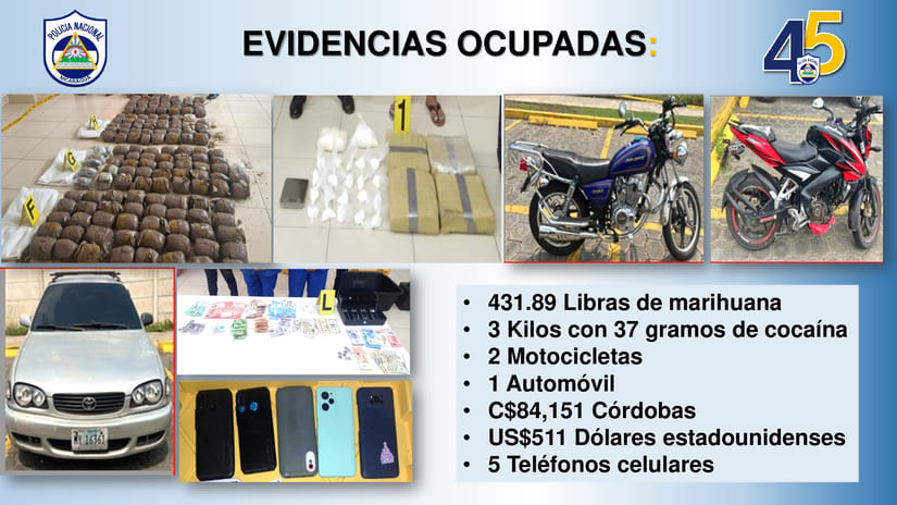 La Policía Nacional capturó a tres personas que se le incautó 431.89 libras de marihuana y tres kilos con 37 gramos de cocaína, dos motocicletas, un automóvil, cinco teléfonos celulares y dinero, en los distritos III y X de Managua, informó este lunes el Jefe de la Dirección de Auxilio Judicial, Victoriano Ruiz.