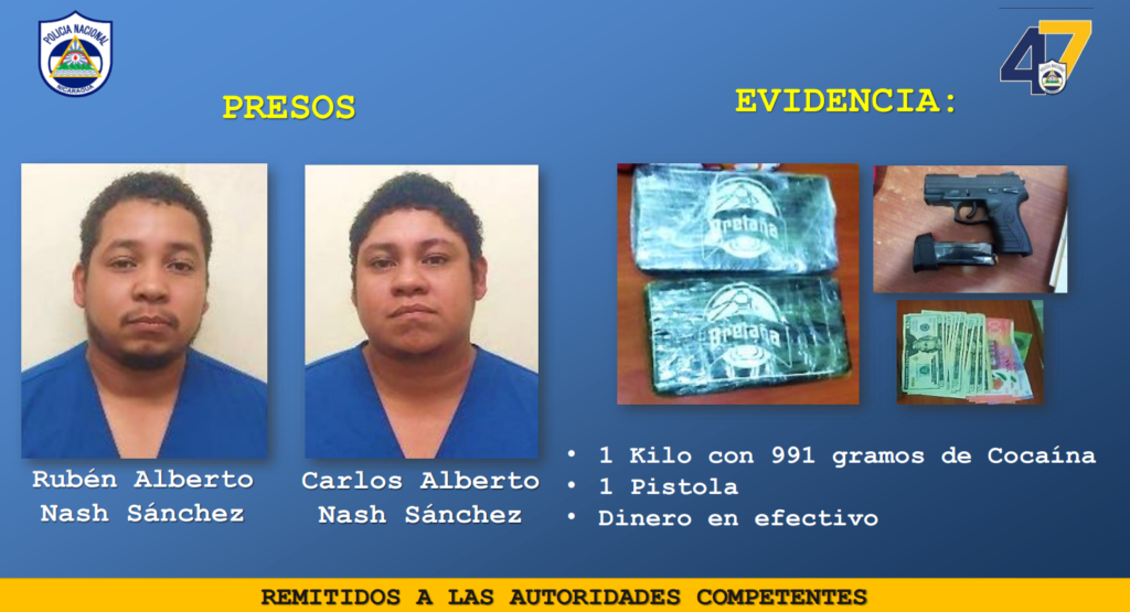 “La Policía Nacional perfiló una motocicleta Yamaha color negro placa RN 16 573 conducida por Rubén Alberto Nash Sánchez de 29 años de edad acompañado por Carlos Alberto Nash Sánchez de 31 años de edad. En requisa corporal fueron ocupados dos paquetes envueltos en cinta adhesiva conteniendo sustancia color blanco. La prueba de campo dio positivo a cocaína con un peso de un kilo con 991 gramos”, detalló el informe de la institución del orden dado a conocer este martes.