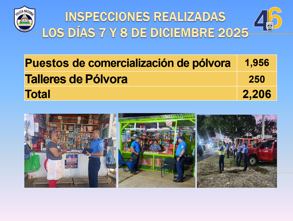 Como parte del plan de seguridad, se efectuaron además, 2 mil 206 inspecciones a los negocios de pólvora, visitando 250 talleres y mil 959 puestos de venta de juegos pirotécnicos.