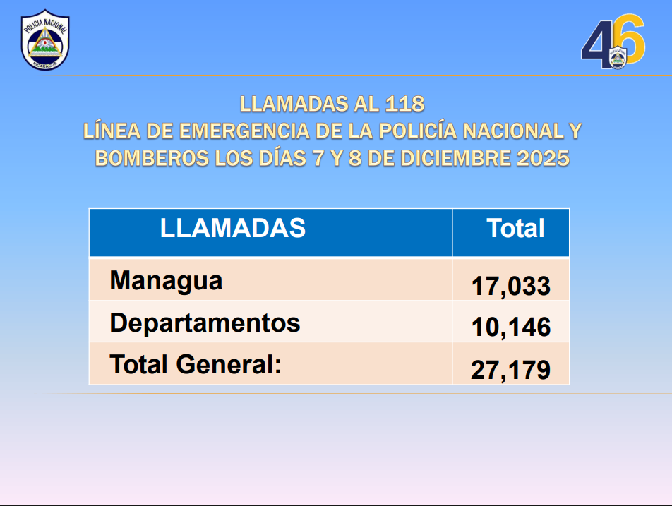 En tanto, a través de la línea de emergencia 118, entre el 7 y 8 de diciembre se recibieron 27 mil 179 llamadas, de las cuales, 17 mil 33 fueron en Managua y 10 mil 146 en los departamentos.
