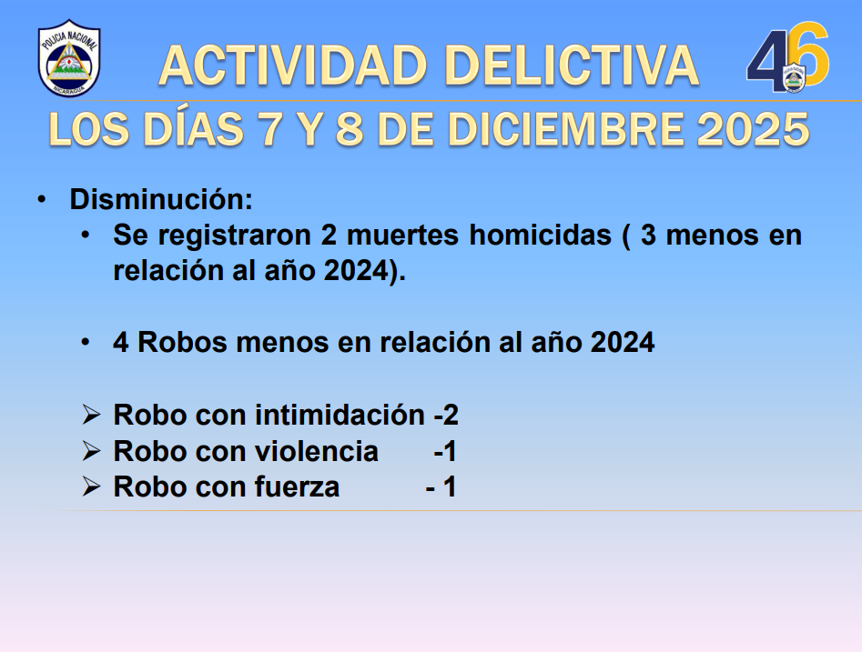 Un descenso en la actividad delictiva y en los accidentes de tránsito con muertos y lesionados; es lo que registró la Policía Nacional entre el 7 y 8 de diciembre, donde se garantizó seguridad a las familias que participaron en La Gritería, los que visitaron los mercados, parques, terminales de buses, destinos turísticos y balnearios.