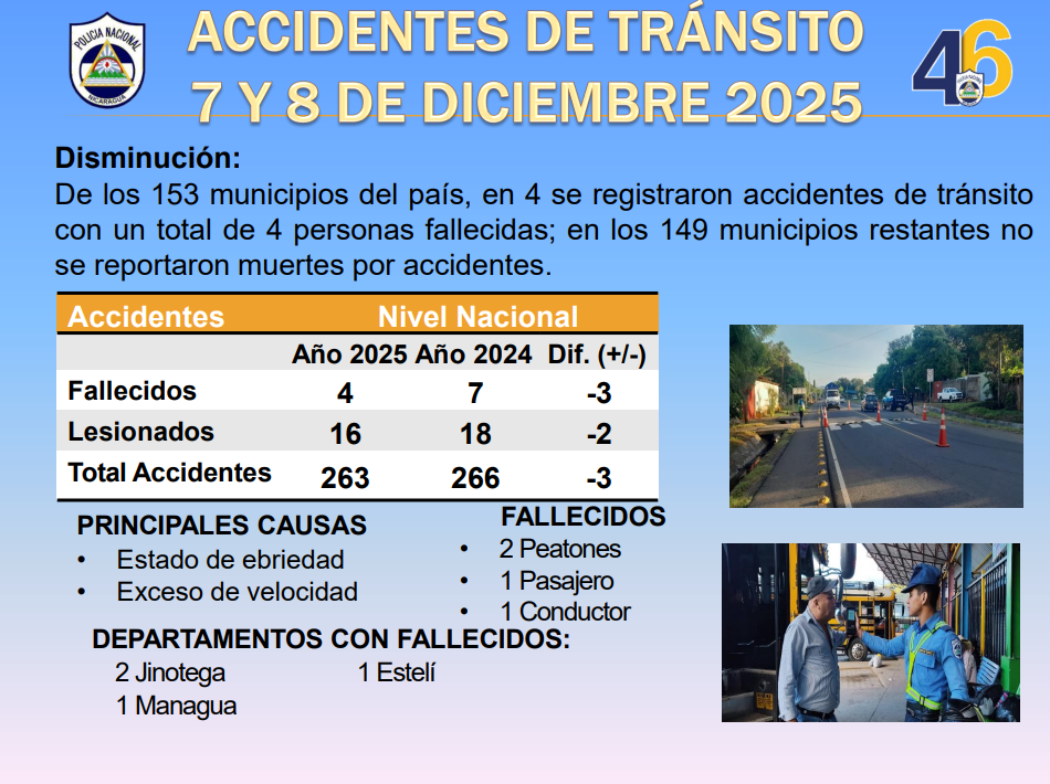 “En los 149 municipios restantes no se reportaron muertes por accidentes. En fallecidos en el año 2025, cuatro. En el año 2024, siete, tenemos un total de menos tres personas fallecidas, con lesionados 16 en el año 2025. En el año 2024, 18 con un total de menos dos personas lesionadas. En total de accidentes de tránsito 263 en el año 2025 y 266 en el año 2024 con una diferencia de menos tres accidentes de tránsito”, explicó.