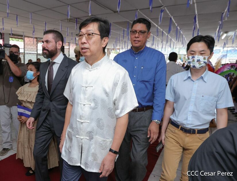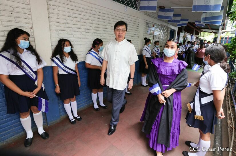 En el acto de entrega que se realizó en el Colegio Público Rubén Darío, ubicado en el distrito IV, participaron, Laureano Ortega Murillo, asesor para la Promoción de Inversiones, Comercio y Cooperación Internacional, Chen Xi, embajador de la República Popular de China en Nicaragua, Liliam Herrera, ministra de Educación, Ramón Rodríguez, director del Teatro Nacional Rubén Darío y la directora del colegio público Rubén Darío, Gloria Segura.