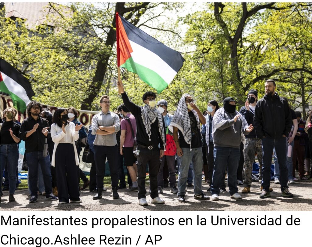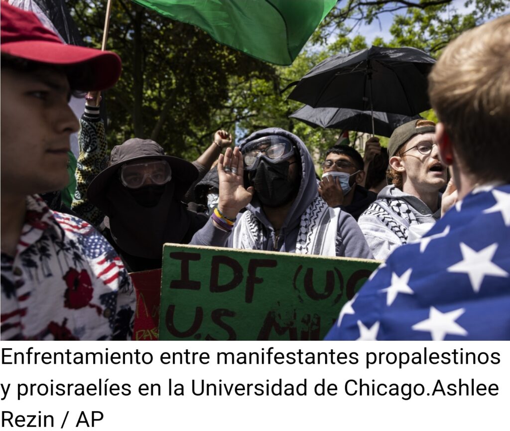 Un enfrentamiento entre manifestantes propalestinos y proisraelíes se dio este viernes en la Universidad de Chicago, en el marco de las protestas estudiantiles que se multiplican por Estados Unidos, reportó el periódico estudiantil The Chicago Maroon.