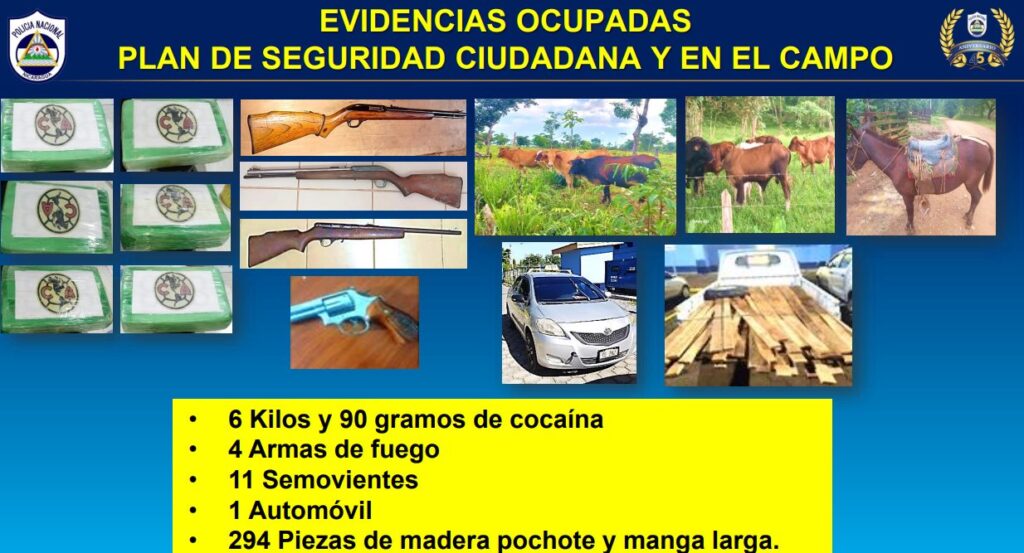 Como evidencias, se les incautó a estos delincuentes, seis kilos y 90 gramos de cocaína, cuatro armas de fuego, 11 semovientes, un carro y 294 piezas de madera pochote y manga larga.