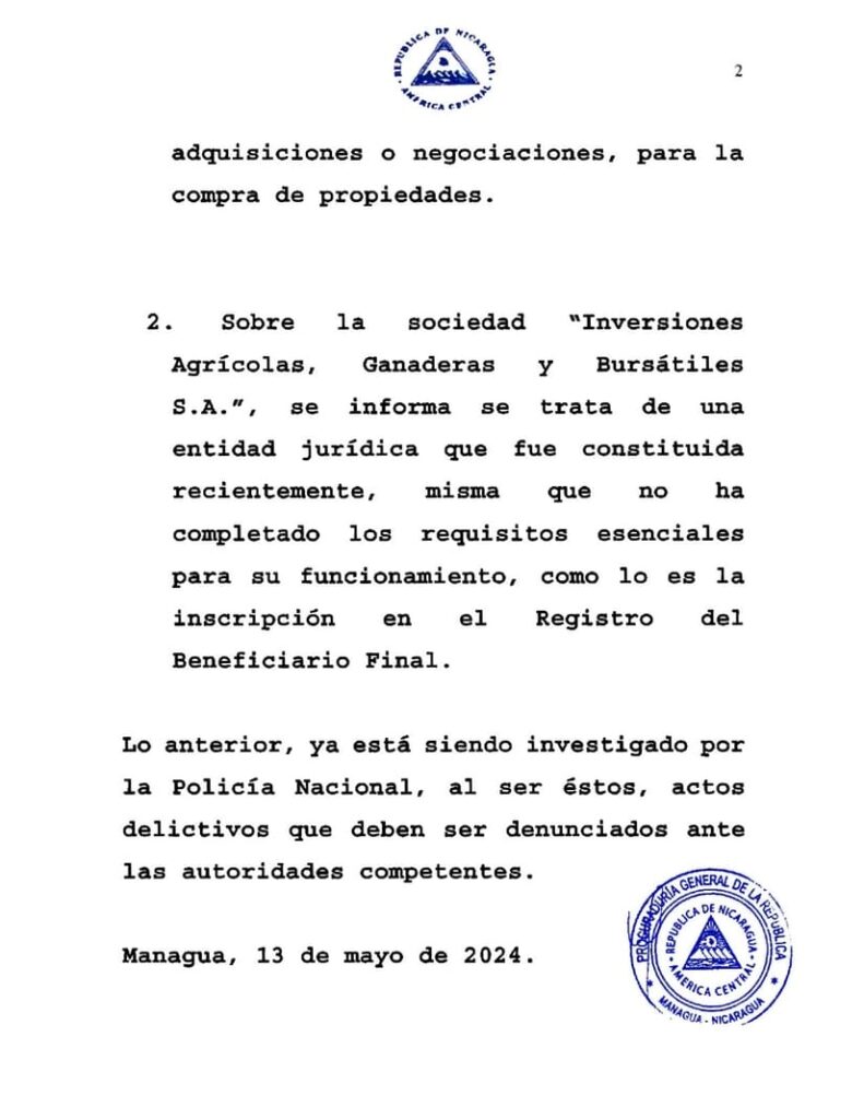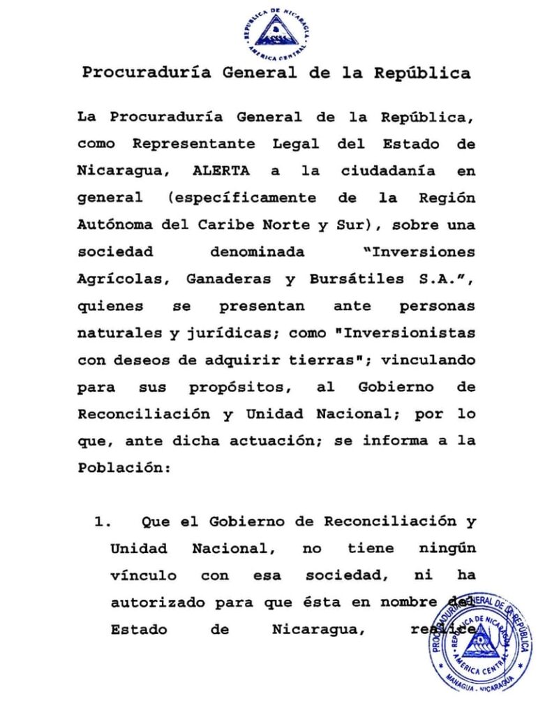 El pasado lunes 13 de mayo, la Procuraduría General de la República (PGR) informó, a través de un comunicado, sobre la investigación a la Sociedad Anónima denominada “Inversiones Agrícolas, Ganaderas y Bursátiles S.A.”, en las Regiones Autónomas de la Costa Caribe Norte y Sur, señalada de fraude en su deseo de comprar tierra en el litoral este del Nicaragua, vinculando para sus propósitos al Gobierno de Reconciliación y Unidad Nacional (GRUN).