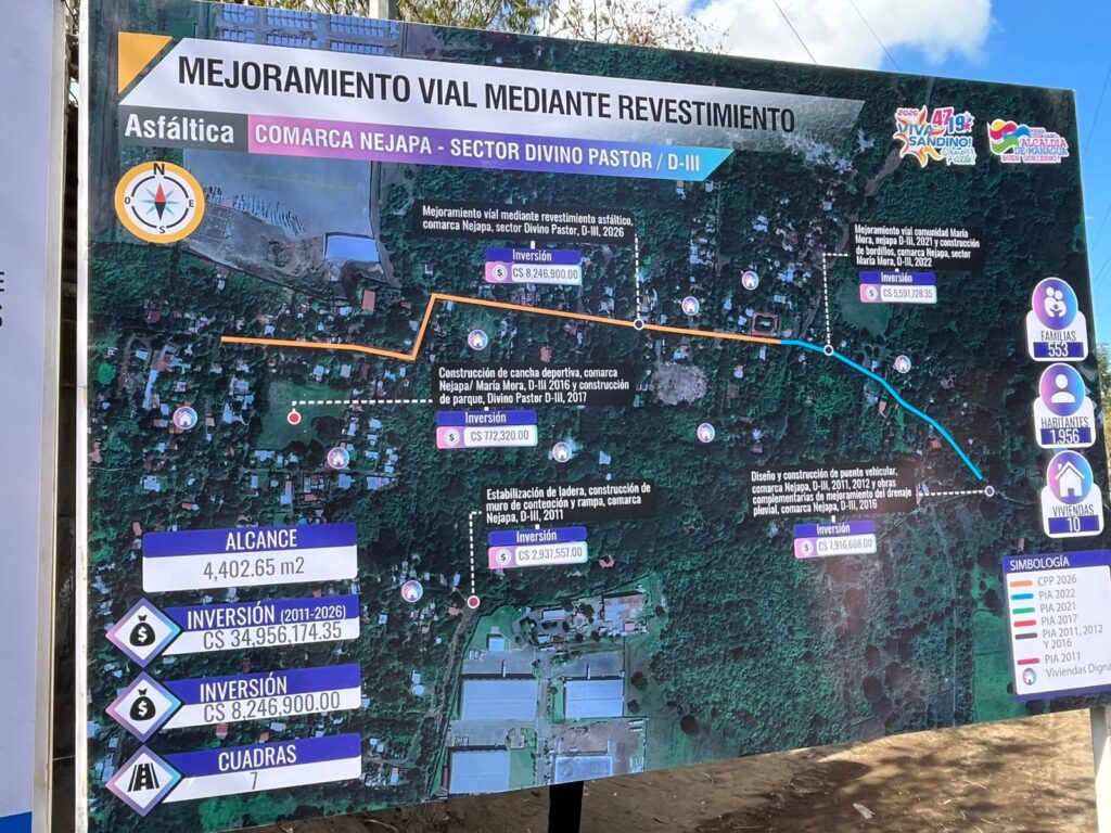 Más de 2 mil habitantes de la comarca Nejapa, en el Distrito III de Managua, contarán con mejores condiciones de acceso vial gracias al revestimiento de siete cuadras que ejecuta la Alcaldía de Managua a través del Programa Calles para el Pueblo.