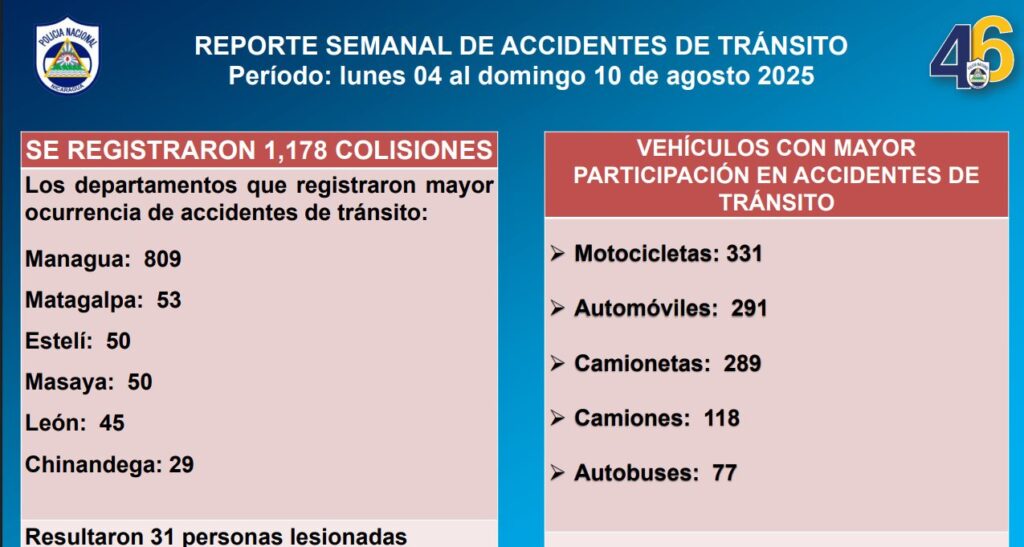 En los primeros días de agosto, la Policía Nacional registró mil 178 accidentes de tránsito, con saldo de 31 lesionados en todo el país, siendo Managua el departamento con más colisiones, con 809; le sigue Matagalpa con 53, Estelí y Masaya con 50 accidentes cada uno, León con 45 y Chinandega con 29.