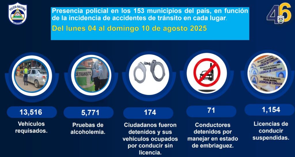 El informe detalló que como resultado del Plan de Emergencia Vial, se requisaron 13 mil 516 vehículos y se realizaron 5 mil 771 pruebas de alcoholemia; logrando la detención de 174 personas y sus vehículos ocupados por conducir sin licencia; así como otros 71 conductores puestos tras las rejas por manejar borrachos y mil 154 licencias de conducir fueron suspendidas.