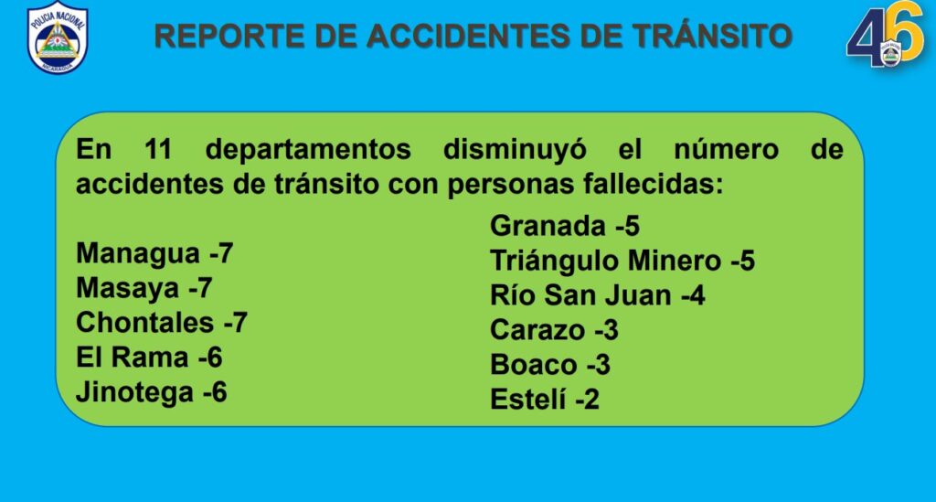 “También la Policía Nacional garantizó acciones preventivas dentro de la campaña permanente Salvá tu Vida, donde se realizaron seminarios y presentación de la Cartilla de Educación Vial para la Protección de la Vida, desarrollo de charlas informativas, visitas casa a casa y asambleas comunitarias, así como actividades en mercado paradas y terminales de buses. Regulación del tránsito vehicular en las inmediaciones de centros educativos de primaria, secundaria y universidades, implementación de medidas de control y regulación del tránsito en 74 tramos de carretera, capacitación dirigida a propietarios de medios de transporte selectivo y colectivo, enfocada en seguridad vial y prevención de accidentes de tránsito”, agregó la funcionaria policial.