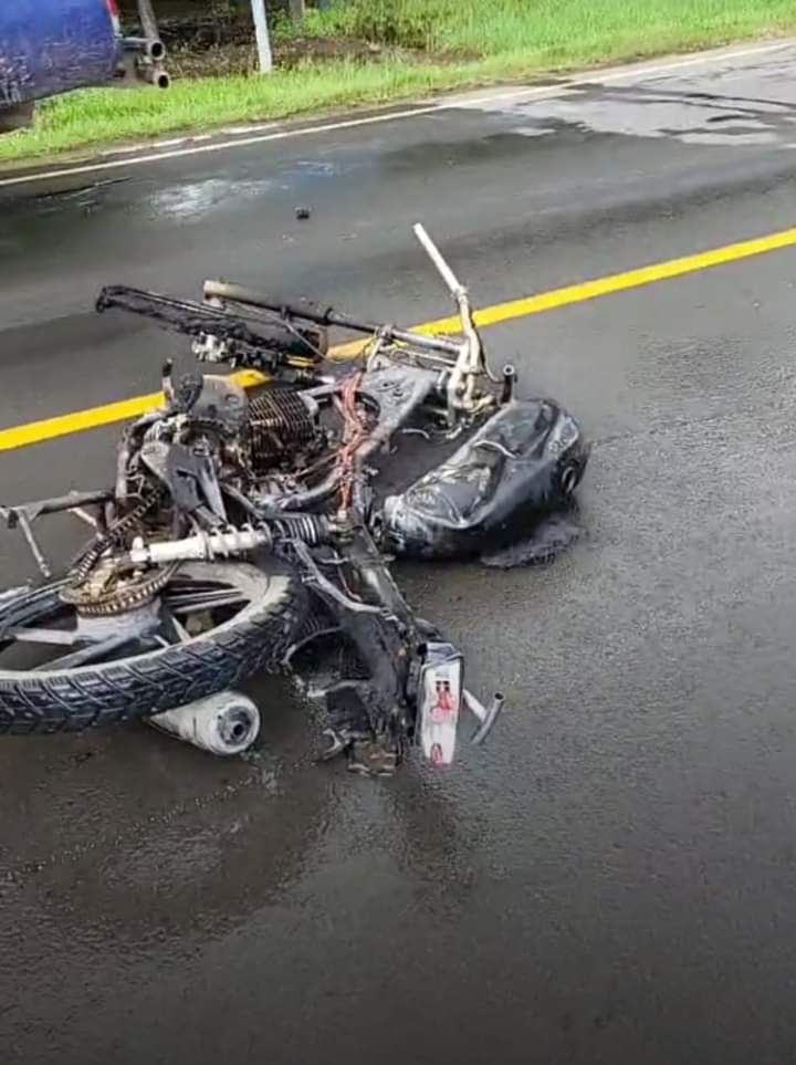 Producto del impacto la motocicleta fue arrastrada varios metros y posteriormente agarró fuego, por lo que fue necesario la presencia del Benemérito Cuerpo de Bomberos.