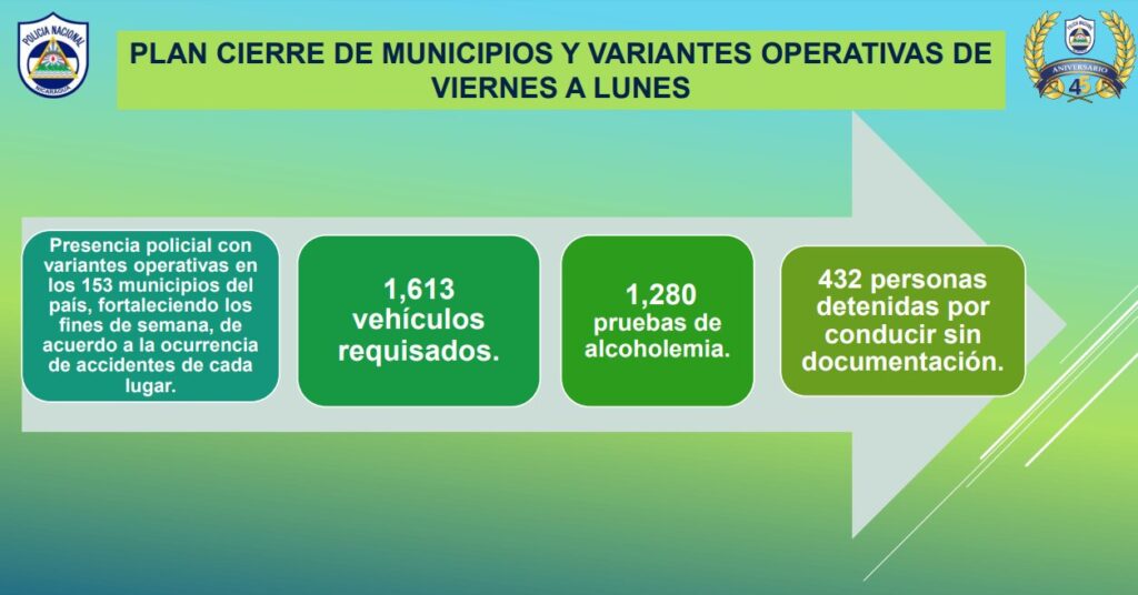 En su informe semanal, el comisionado general Vanegas, destacó que del 1 de enero al 27 de octubre de este año, se han suspendido 36 mil 180 licencias de conducir, se han detenido a 5 mil 195 conductores por ir manejando en estado de ebriedad; mientras que del 21 al 27 de octubre se suspendieron 358 licencias y se pusieron tras las rejas a 76 personas por manejar bajo los efectos del licor.