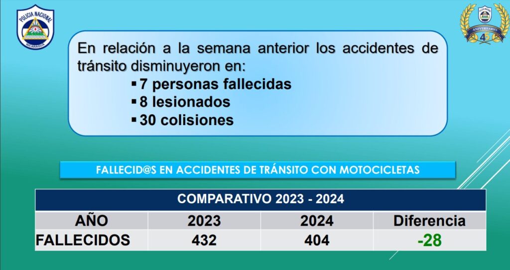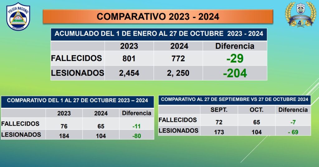 Agregó el jefe policial que gracias a las campañas de prevención, se ha logrado reducir el número de muertos y lesionados en accidentes de tránsito, con 772 fallecidos y 2 mil 250 lesionados a la fecha a diferencia del 2023 que en el mismo período fueron 801 muertos y 2 mil 454 lesionados.