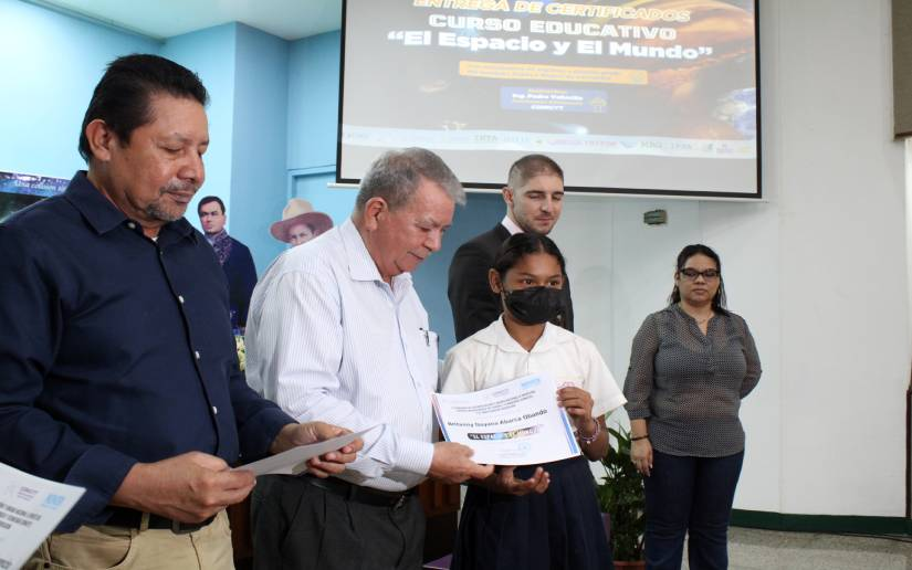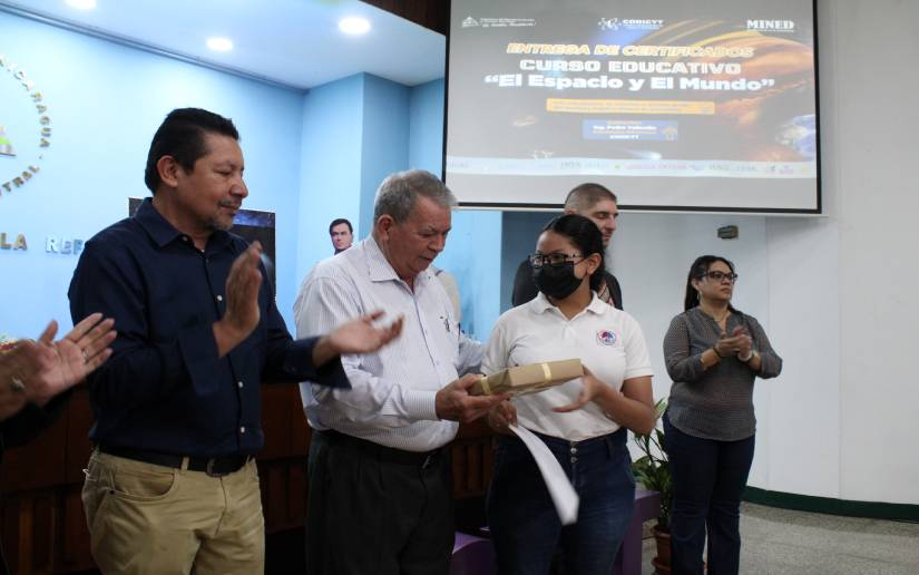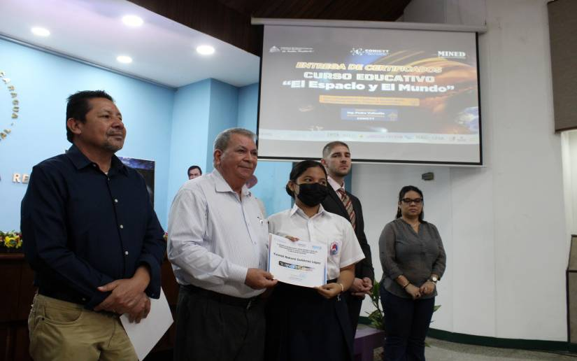 16 estudiantes de secundaria, del colegio Miguel Cervantes, fueron certificados por el Consejo Nicaragüense de Ciencia y Tecnología (CONICYT), por haber participado del primer curso educativo “El Espacio y El Mundo”, que tuvo como objetivo impulsar el conocimiento científico en los alumnos y educadores.