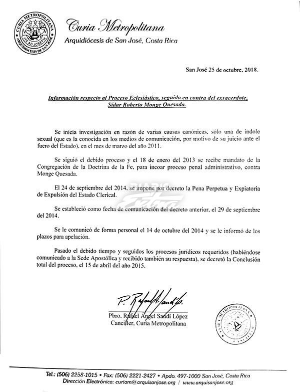 Así fue consignado en un comunicado del 25 de octubre del 2018, titulado Información respecto al proceso eclesiástico, seguido en contra del sacerdote, Sidar Roberto Monge Quesada: