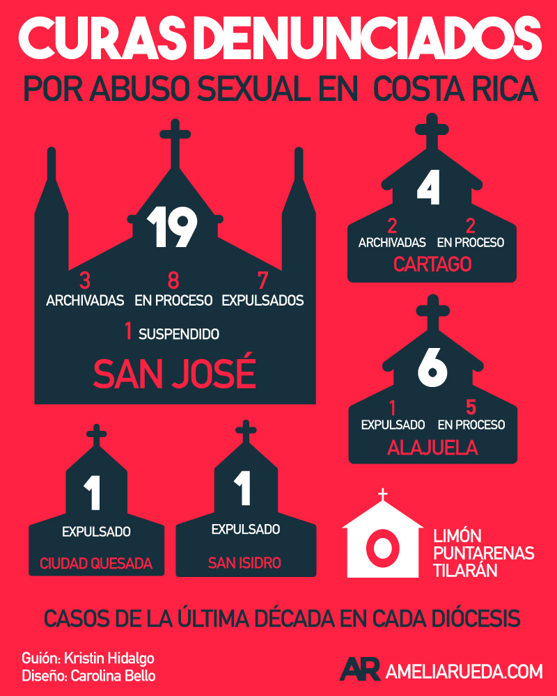 En 2019, el sitio www.ameliarueda.com, reveló que en los últimos 10 años, al menos 29 sacerdotes de la iglesia católica en Costa Rica, fueron denunciados por cometer supuestos actos de abuso sexual, en su mayoría a menores de edad.