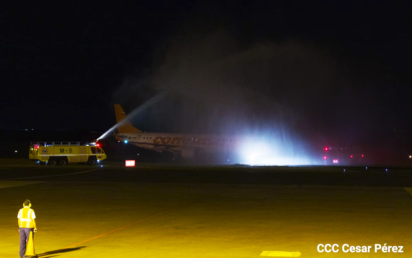 Los bomberos aeroportuarios realizaron el bautizo con chorros de agua, celebrando el reinicio de operaciones de la línea aérea a Nicaragua, la noche de este jueves.