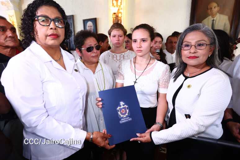 “Entregamos a Gladys, a la compa Luisa, a Gladys de los Ángeles, la máxima orden del Estado Nicaragüense, Orden General de Hombres y Mujeres Libres Augusto Sandino; máximo reconocimiento por todos sus méritos, por su valentía, por su permanente lealtad a los valores de la Revolución Popular Sandinista, esta revolución que estamos creando y recreando todos los días”, expresó la Compañera Rosario.