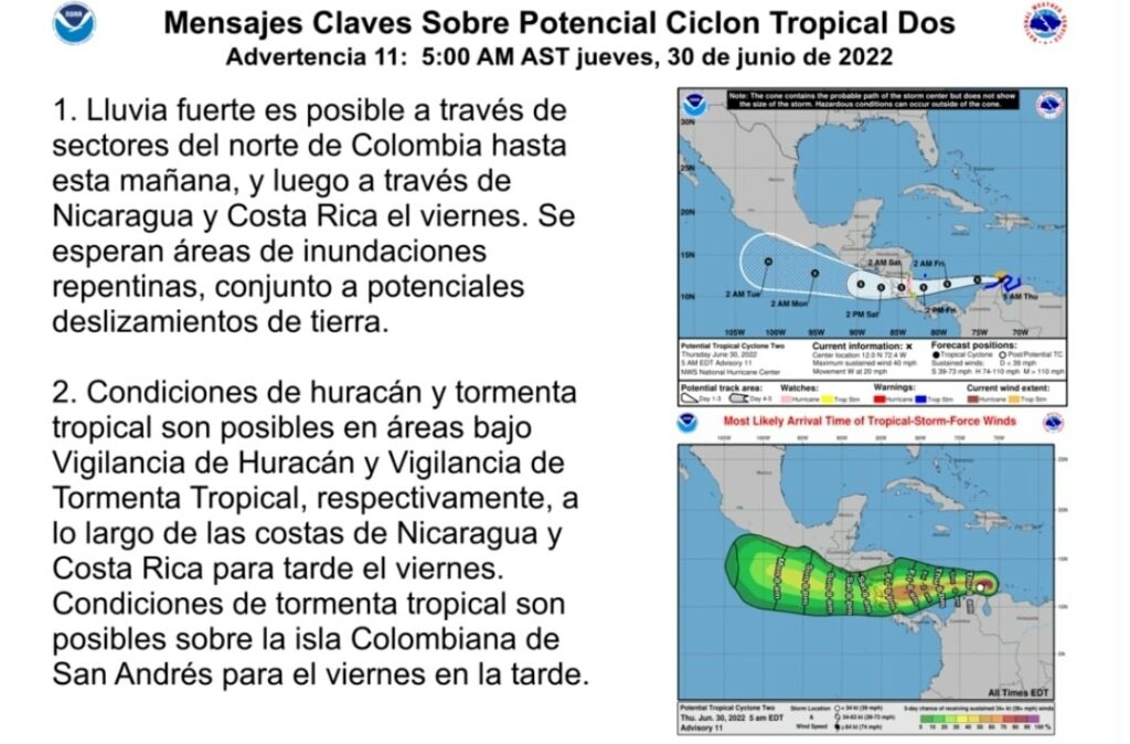 “El sistema se moverá a través del suroeste del Mar Caribe hoy (jueves) hasta el viernes, cruza el sur de Nicaragua o el norte de Costa Rica el viernes por la noche, y emerge sobre el Océano Pacífico oriental el sábado”, señaló el informe publicado esta mañana.