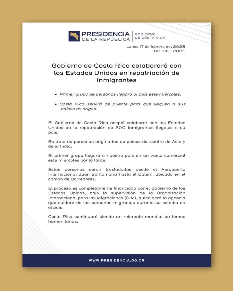 Aunque las autoridades de Costa Rica afirmaron después de la visita del secretario de Estado de EEUU, Marco Rubio, que no recibirían vuelos de deportados como parte de los acuerdos con el funcionario, eso no era cierto pues a través de un comunicado de la Presidencia anunció este lunes que apartir de este miércoles empezarán a recibir a 200 deportados de origen asiático.