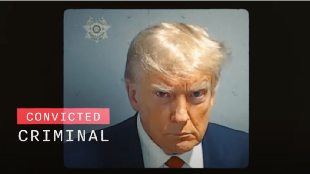 “En la sala del tribunal vemos a Donald Trump tal y como es. Ha sido declarado culpable de 34 delitos graves, declarado responsable de agresión sexual y cometió fraude financiero“, afirma el narrador del video.