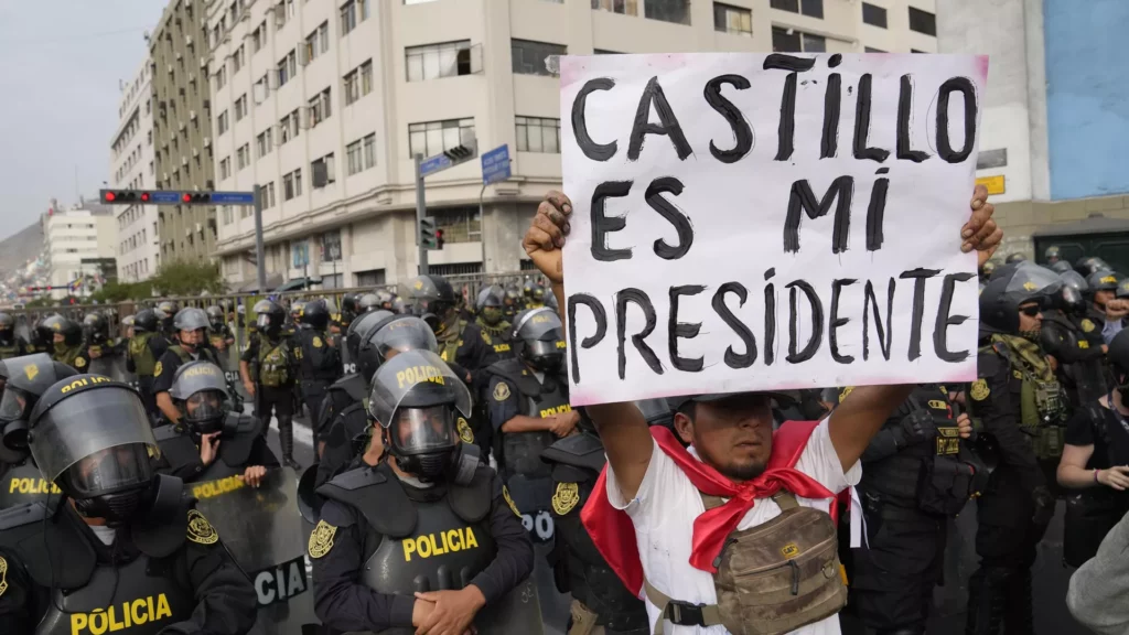 Las protestas se intensificaron el 9 de diciembre en inmediaciones de la sede del Parlamento, en Lima. Con carteles, banderas y al grito de “Dina Boluarte, no me representas” o “Dina Boluarte, traidora”, los manifestantes se reunieron para rechazar al nuevo Gobierno instaurado y apoyar a Castillo que está detenido en instalaciones de la Dirección de Operaciones Especiales (Diroes) de la Policía Nacional de Perú.