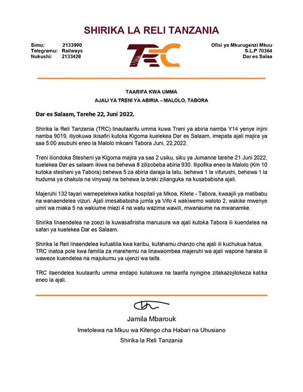 “Salió de la estación de Kigoma a las 14:00 horas (11H00 GMT) del martes 21 de junio de 2022 a Dar es Salaam con ocho vagones de 930 pasajeros por la zona de Malolo (10 km)”, informó la Corporación de Ferrocarriles de Tanzania (TRC) en un comunicado.