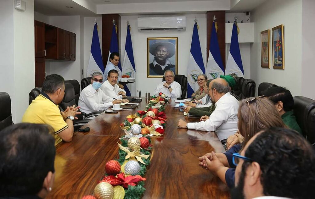 Al encuentro con el embajador Mayo, asistieron el presidente de la Asamblea Nacional, Gustavo Porras, la comandante guerrillera del Frente Sandinista de Liberación Nacional (FSLN, izquierda) Gladys Báez, el presidente de la bancada mayoritaria del partido gobernante Edwin Castro y miembros del Grupo Parlamentario Amistad Nicaragua-Cuba.
