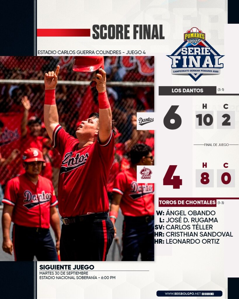 La maquinaria roja de Los Dantos vencieron este domingo, seis carreras a cuatro a Los Toros de Chontales, poniendo la serie final del Pomares 2025 (3-1) a favor de los capitalinos, que están a una victoria de conseguir el campeonato.