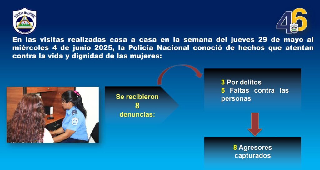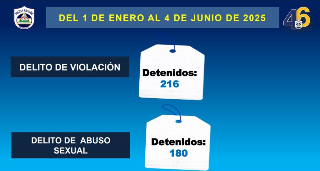 “Del primero de enero al 4 de junio del 2025, en el caso de delito de violación llevamos un total de 216 detenidos, en el caso de los delitos de abuso sexual llevamos un total de 180 detenidos”, destaca el informe dado a conocer este jueves.