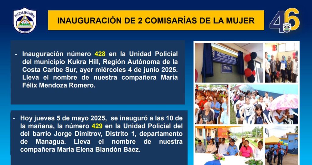 Asimismo, esta semana se inauguró la Comisaría de la Mujer número 428, ubicada en Kukra Hill, en el Caribe Sur y la 429 en el barrio Jorge Dimitrov, Distrito I, departamento de Managua.