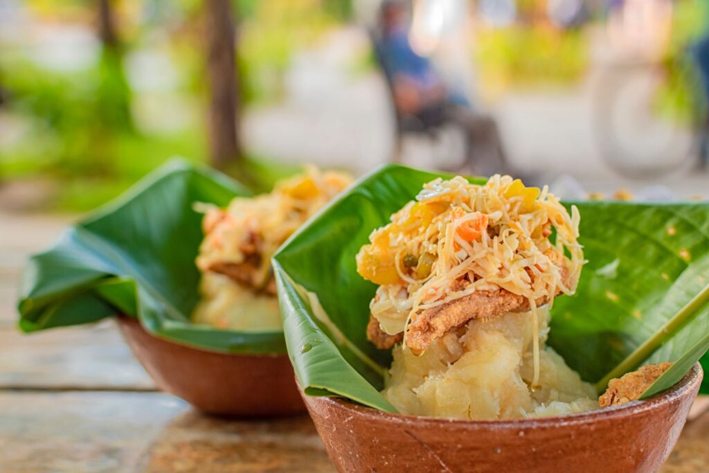 El vigorón es un plato típico nicaragüense, que consiste en yuca cocida con chicharrón y encima una ensalada de repollo preparada con tomate y vinagre; todo servido en hoja de plátano.