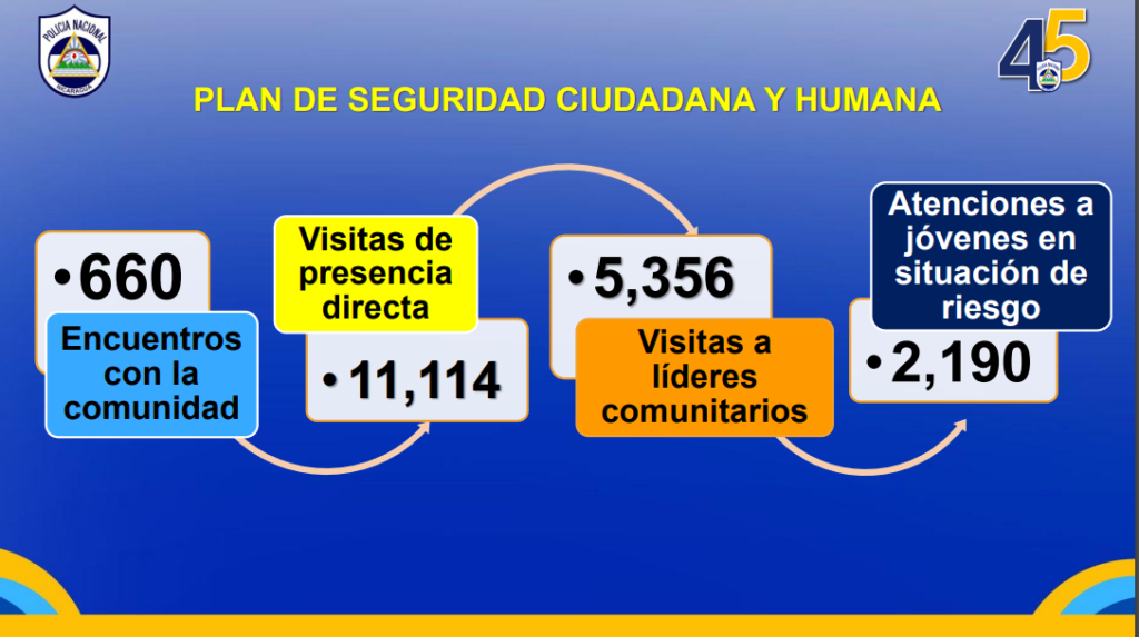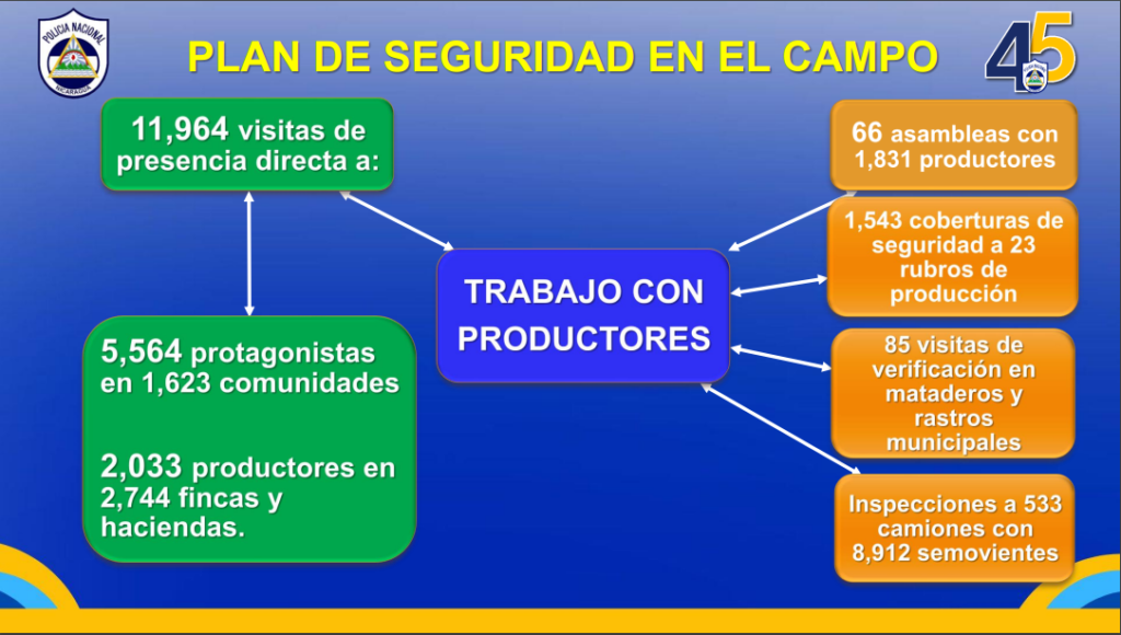 Asimismo, detalló que como parte de este plan los agentes policiales a nivel nacional desarrollaron 11 mil 964 visitas directas a 5 mil 564 protagonistas en mil 623 comunidades, entre estos 2 mil 33 productores de 2 mil 744 fincas y haciendas.