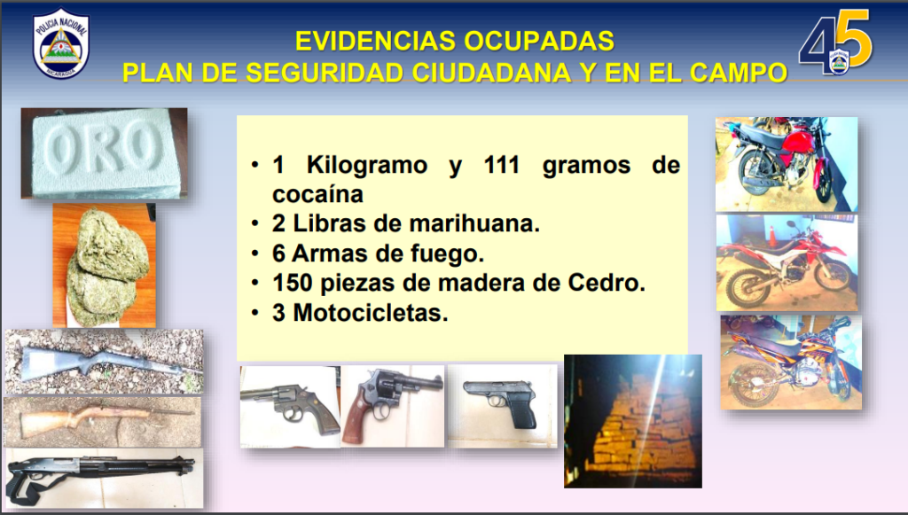 “Entre las evidencias ocupadas a estos delincuentes se encuentran un kilogramo y 111 gramos de cocaína, dos libras de marihuana, seis armas de fuego, 150 piezas de madera de cedro y tres motocicletas”, detalló el comisionado.