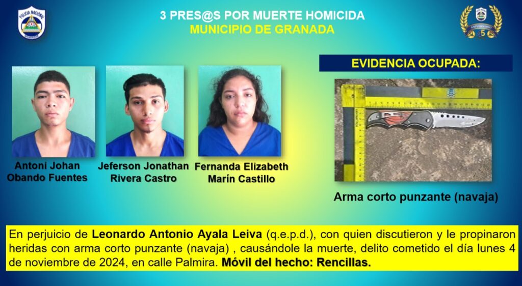 Asimismo, fueron detenidos; Antoni Obando Fuentes, Jeferson Rivera Castro y Fernanda Marín Castillo, quienes motivados por rencillas personales propinaron heridas con arma corto punzante a Leonardo Ayala, causándole la muerte el pasado 4 de noviembre en la Calle Palmira, Granada.