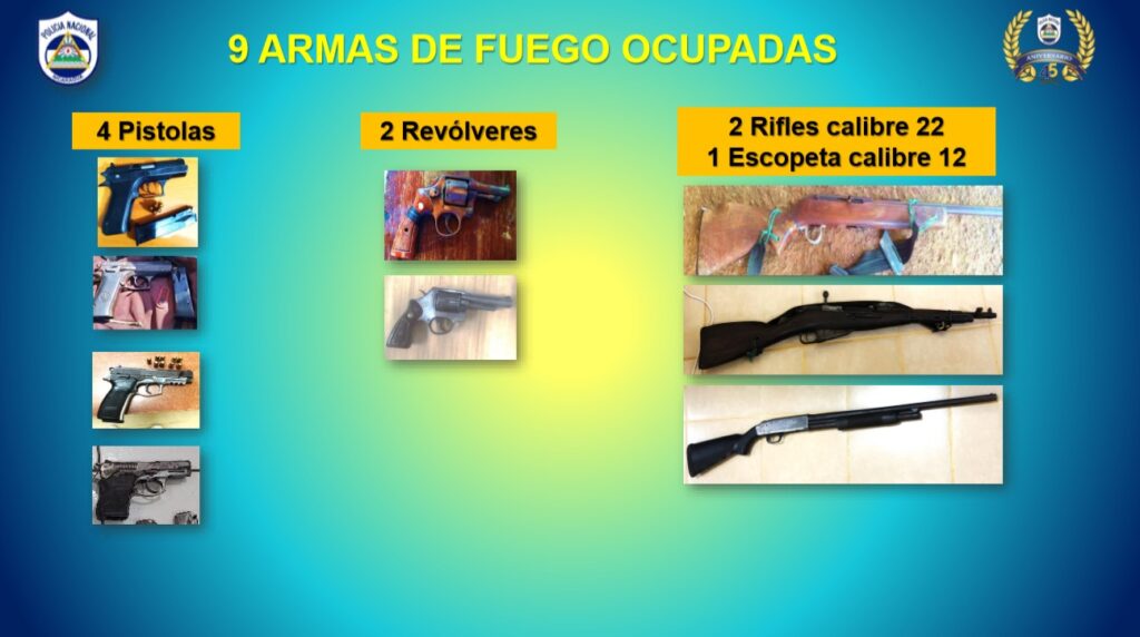 Vanegas también informó sobre la detención de nueve sujetos que cometían delitos en los distritos de Managua y ocho en otros departamentos, ocupándoles como evidencias; nueve armas de fuego, entre estas, cuatro pistolas, dos revólveres, dos rifles calibre 22 y una escopeta calibre 12.
