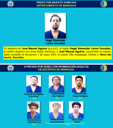 El otro detenido por muerte homicida fue Hegel Alexander Larios González, quien le disparó con arma de fuego hechiza a José Manuel Aguirre, causándole la muerte. El delito lo cometió 1 de mayo en el barrio Villa Guadalupe, Distrito II de Managua, siendo el móvil rencillas.