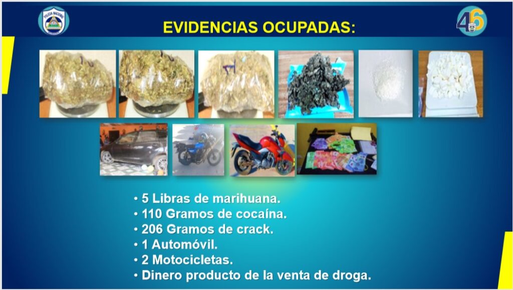 Vanegas señaló, que a estos cuatros sujetos se les incautó, cinco libras de marihuana, 110 gramos de cocaína, 206 de piedras de crack, un automóvil, dos motocicletas, y dinero en efectivo producto de la venta de estupefacientes.