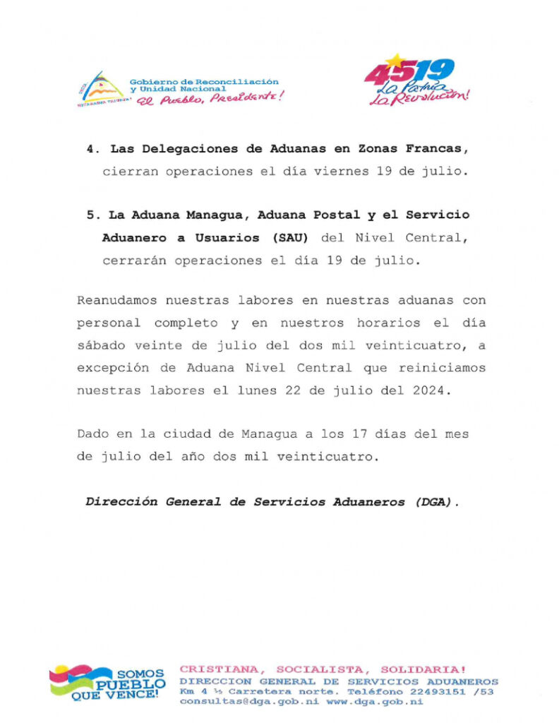 La Dirección General de Servicios Aduaneros (DGA), comunica a todos los usuarios que a diario realizan gestiones en nuestra institución, que conforme el comunicado del Ministerio del Trabajo (MITRAB), en ocasión de celebrar el viernes 19 de Julio el 45 aniversario del glorioso triunfo de nuestra Revolución Popular Sandinista.
