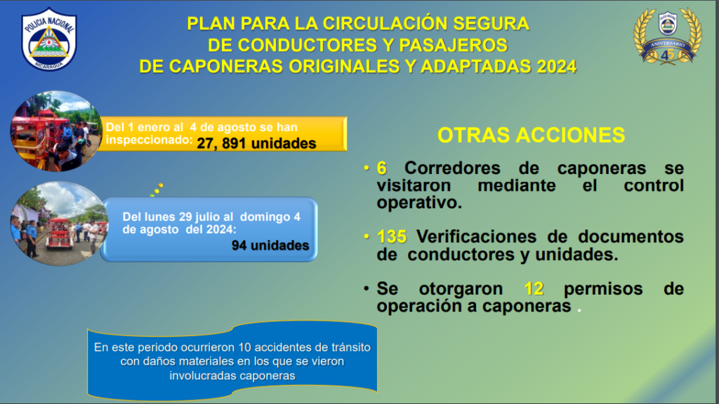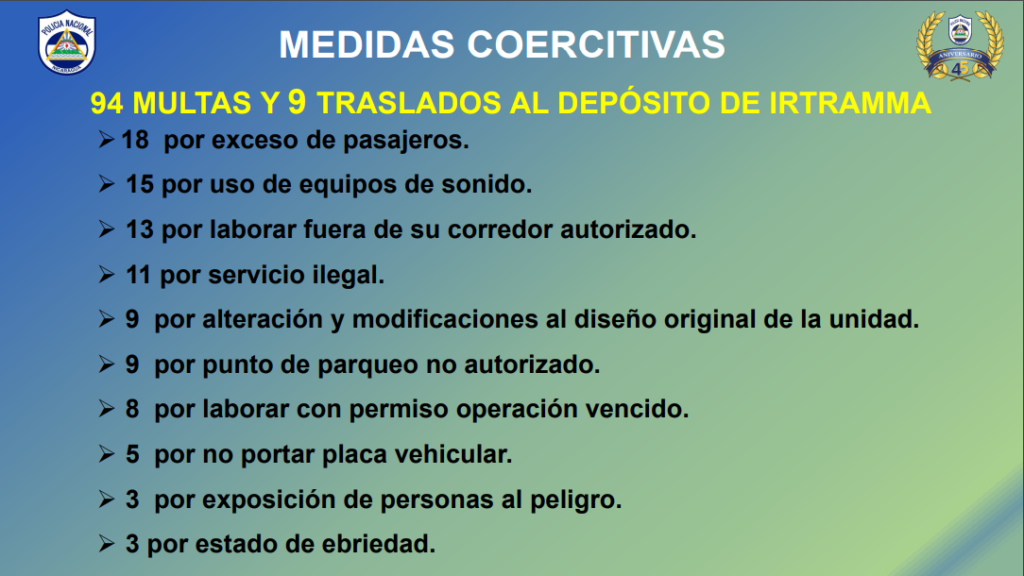 Del 29 julio al 4 de agosto, la policía en coordinación con el Instituto Regulador del Transporte Municipal de Managua, aplicaron 94 multas y nueve traslados al depósito municipal.