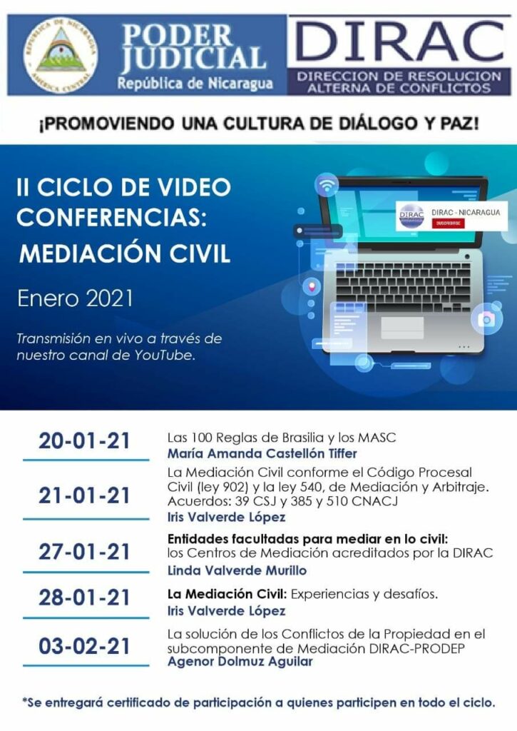 “En 2020, iniciamos el proceso de presentación de conferencias a través del canal de YouTube de la DIRAC. A través de las Tecnologías de la Información y la Comunicación (…) tenemos un sistema de justicia más diverso, más accesible para la población (…) El ciclo de este año está enfocado en la medicación civil, el arbitraje, es decir todo lo que tenga que ver con el derecho privado de la persona”.