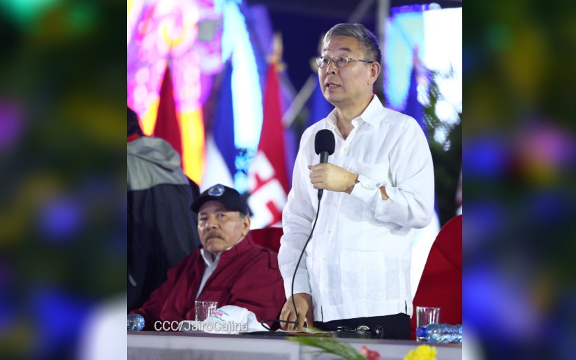En su mensaje, trasladó el saludo y felicitación del Secretario General y Presidente Xi Jinping, al pueblo y Gobierno de Nicaragua en ocasión de arribar a los 46 años del triunfo de la Revolución Popular Sandinista.