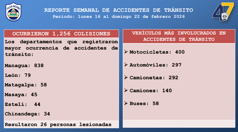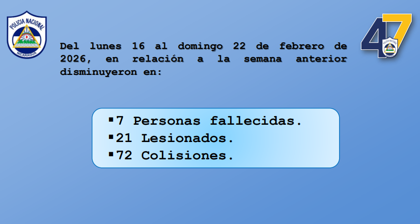En el período del 16 al 22 de febrero disminuyeron las personas fallecidas, lesionadas y las colisiones, entre los mil 256 accidentes de tránsito que ocurrieron en Nicaragua, informó la Cojefa de Relaciones Públicas de la Policía Nacional, comisionada Karen Obando.