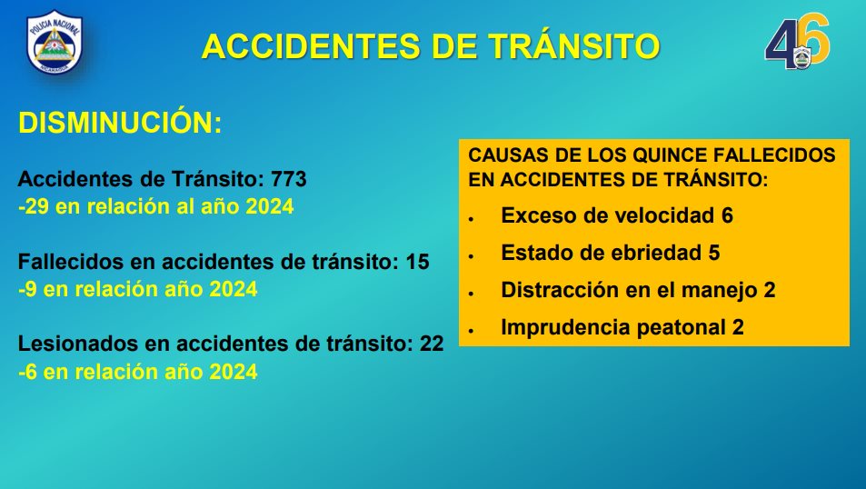 “En accidentes de tránsito fueron 773, en relación al año 2024, tenemos una disminución de  menos 29. En fallecidos en accidentes de tránsito son 15, en relación al año 2024 tenemos menos nueve. Lesionados en accidente de tránsito son 22, en relación al año 2024 son menos seis. La causa de los 15 fallecidos en accidente de tránsito son seis por exceso de velocidad, cinco por estado de ebriedad, dos por distracción en el manejo y dos por imprudencia peatonal”, detalló la Cojefa de Relaciones Públicas de la institución del orden público, subcomisionada Karen Obando.